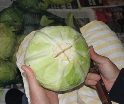 Remove the outer leaves and cut off excess roots on top of cabbage heads.
